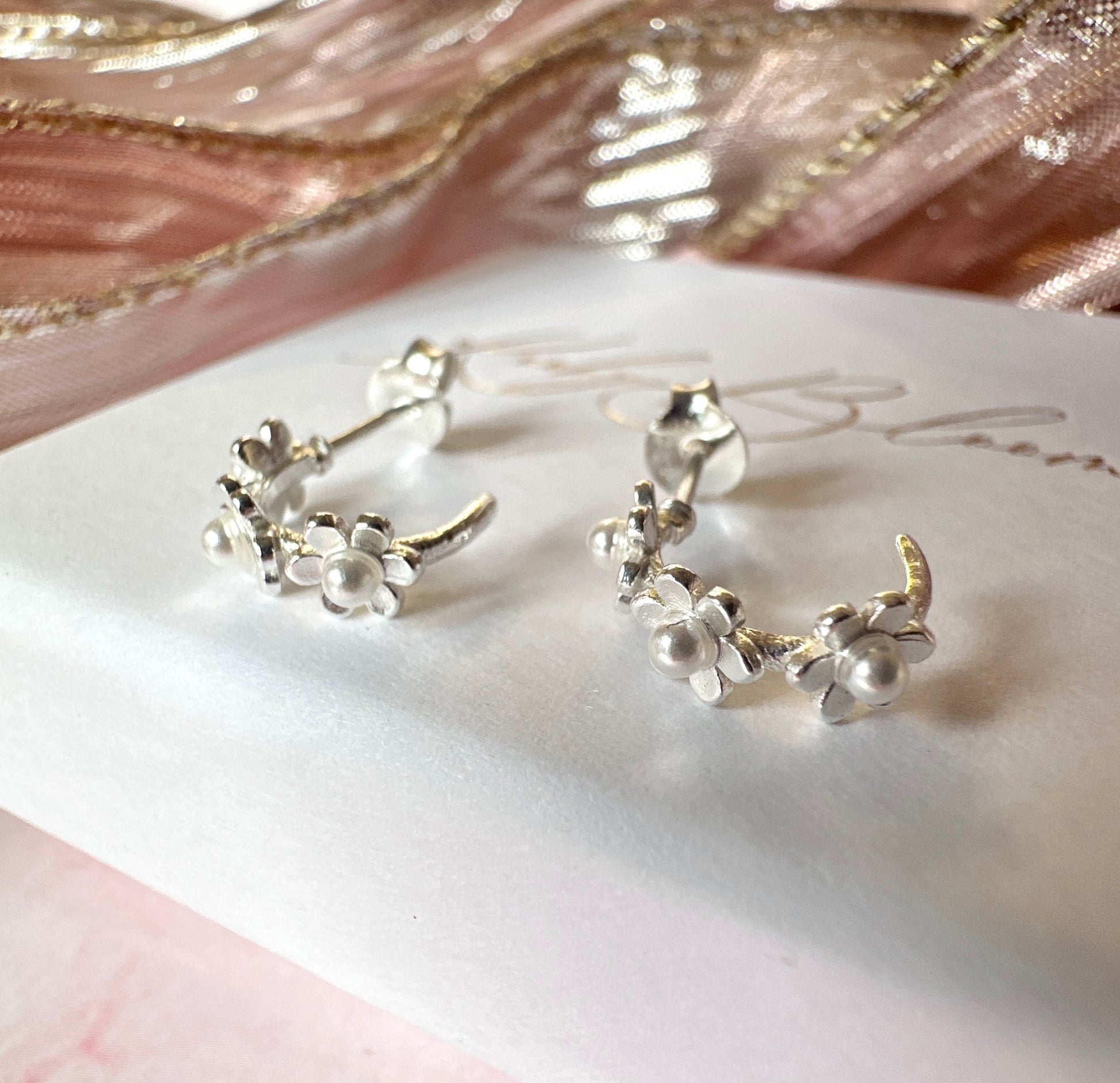 925 Sterling silver Pearl Flower half hoop stud earrings.