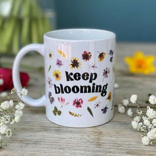 The mugs are covered in pressed flower print with the feel good “keep blooming” slogan in a funky 70s font.