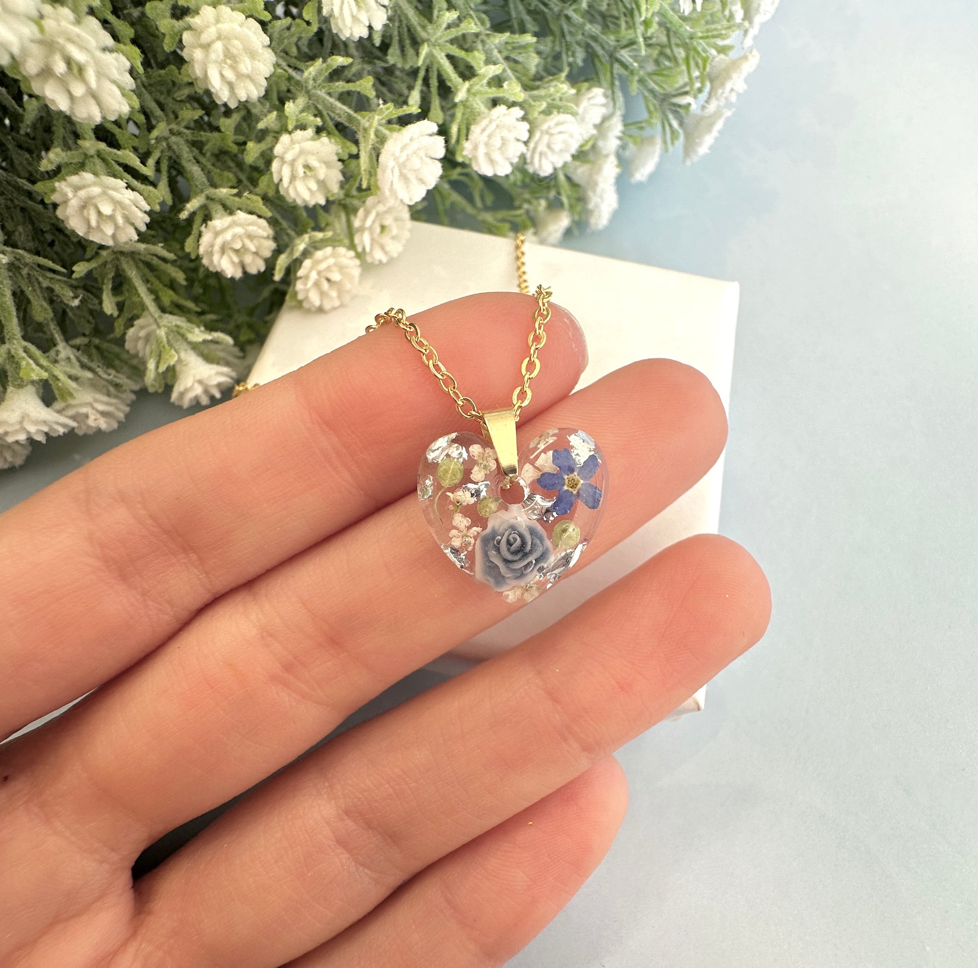 Gold Powder blue Forget me not Mini heart Necklace