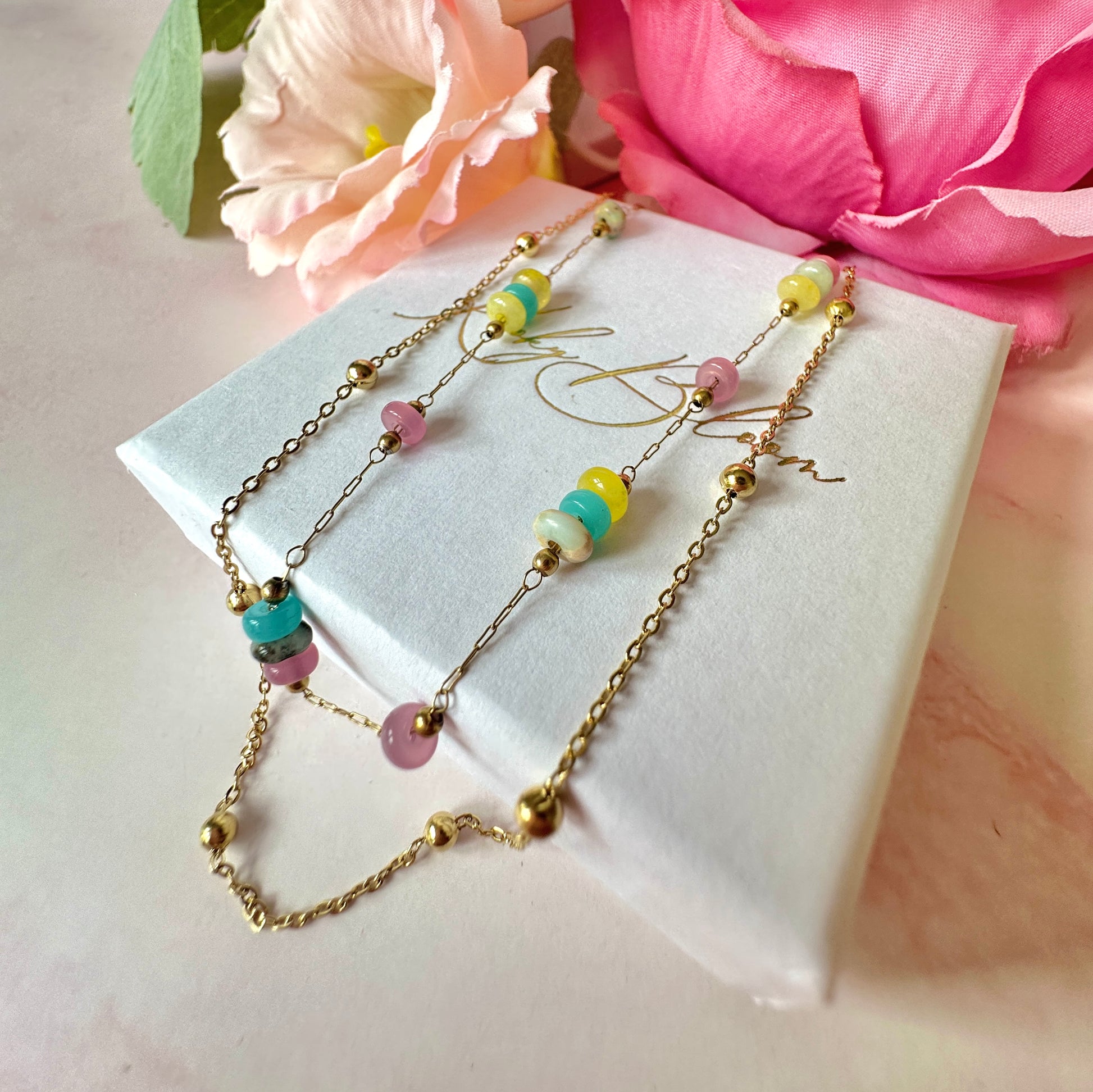 Gold Multicoloured gemstone bead layered necklace.