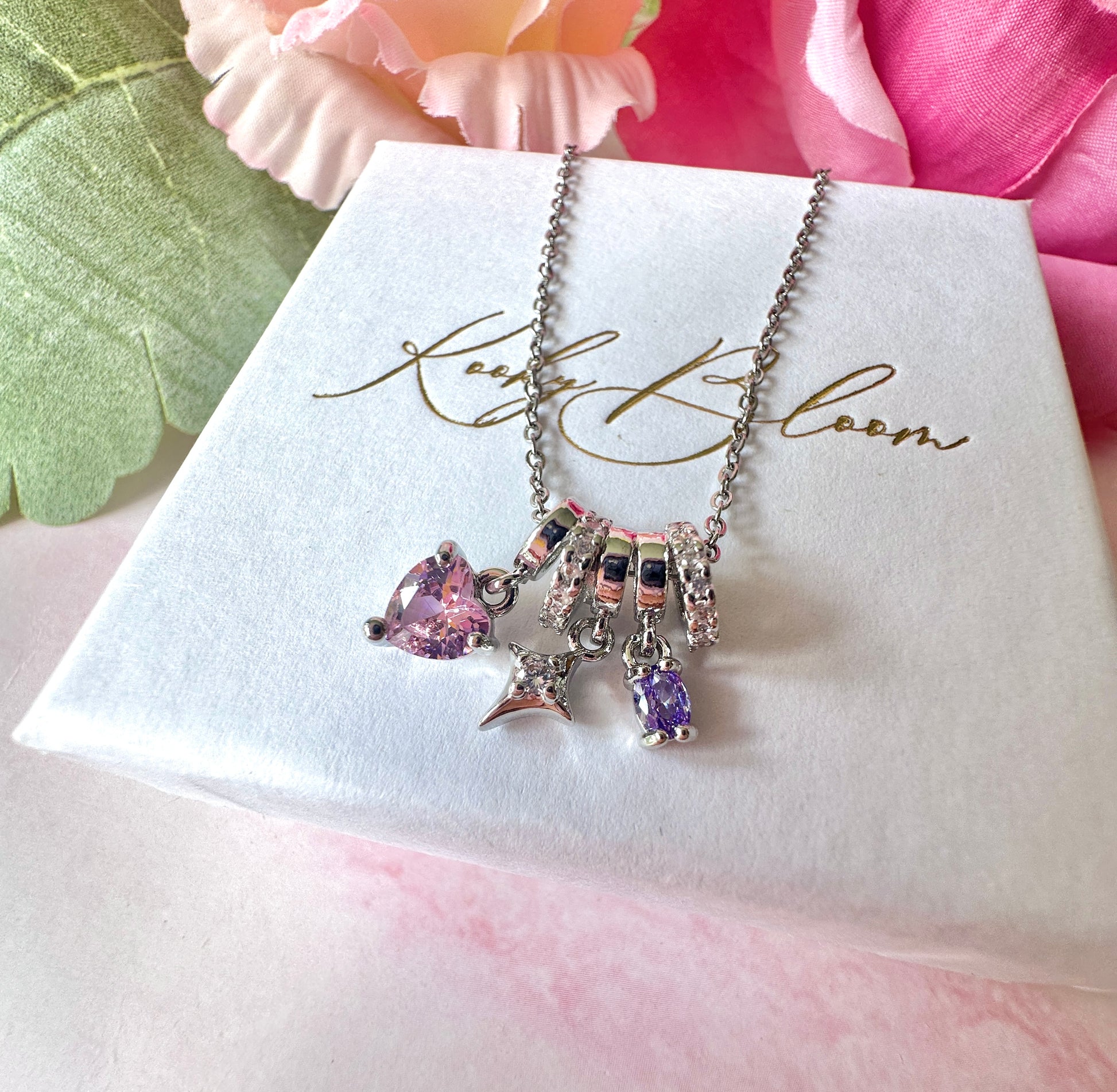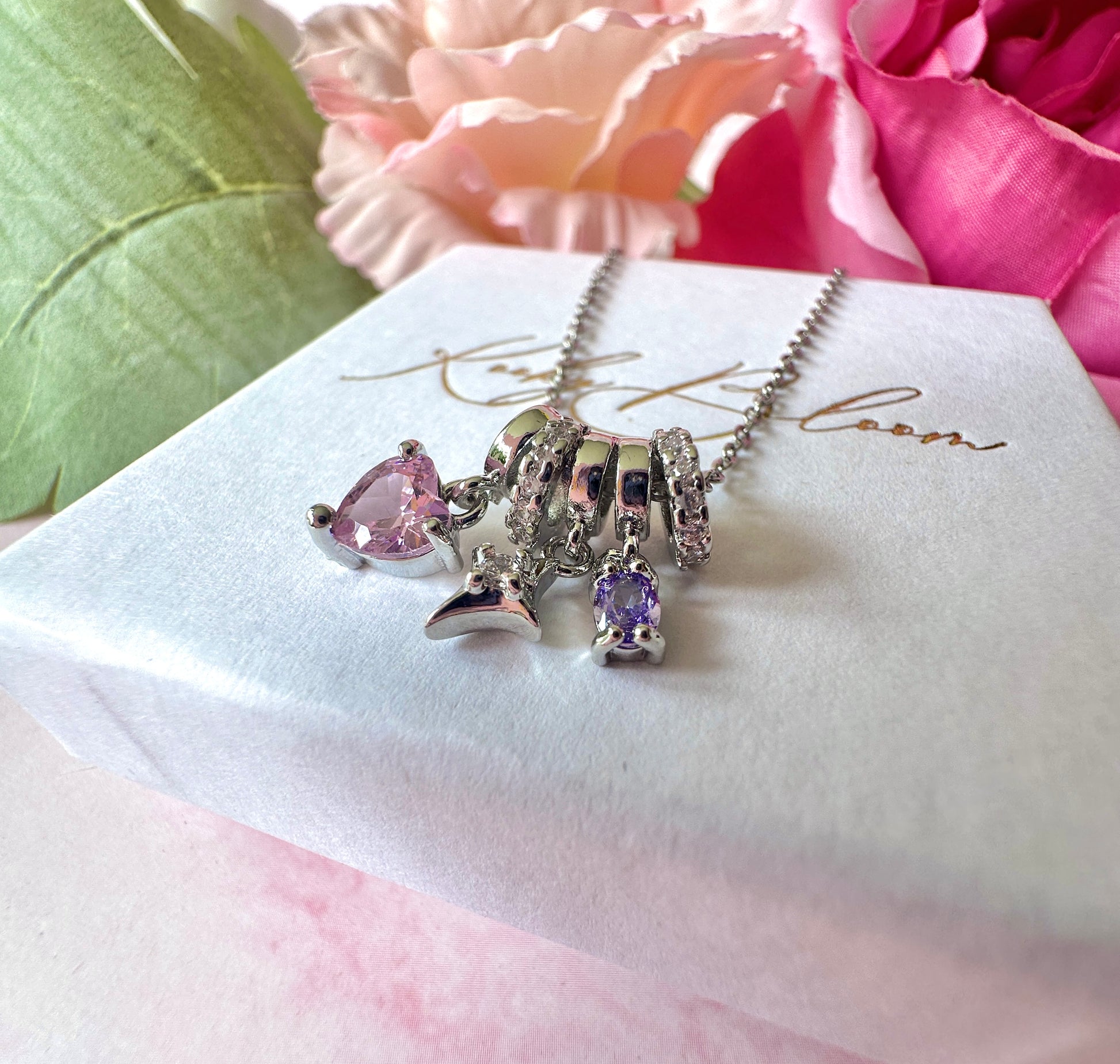 Silver Lilac Pink Cz Heart & Star charm cluster necklace.
